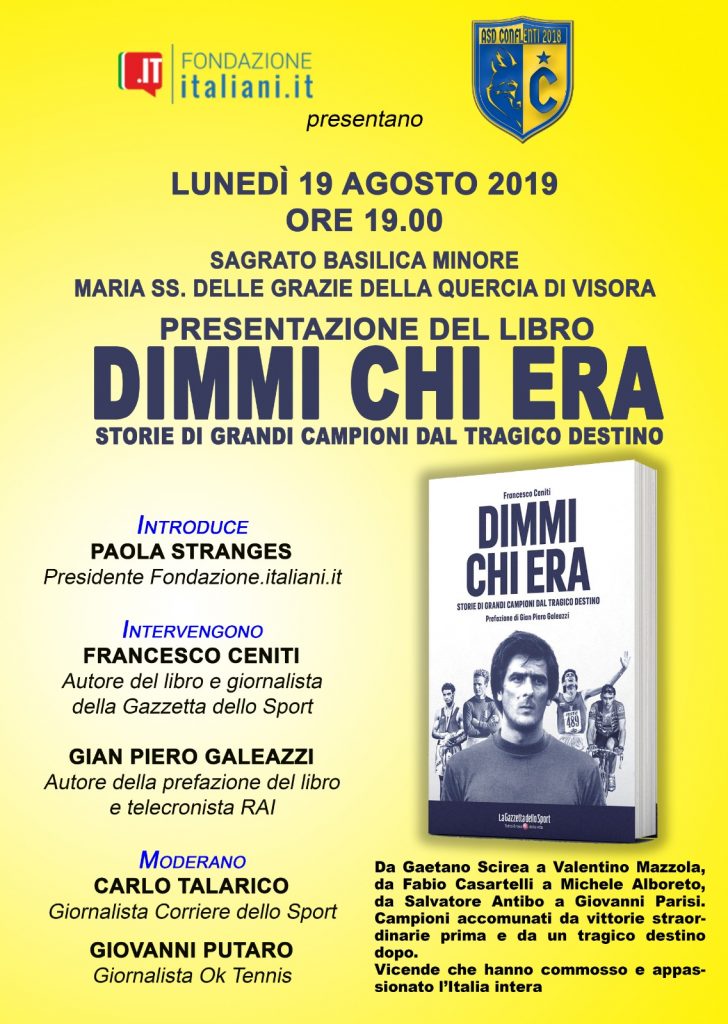 Per lunedì prossimo, 19 agosto alle ore 19.00, ci sarà la presentazione del libro di Francesco Ceniti “Dimmi di chi era”, incentrato sulla storia di 12 campioni dello sport dalla vita e dalla carriera appassionanti e commoventi.