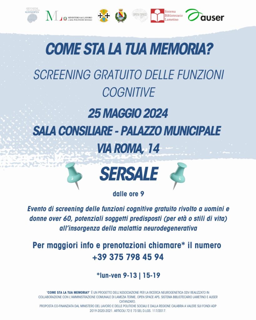 Continuano gli incontri gratuiti delle funzioni cognitive relativi al progetto “Come sta la tua memoria? Prevenzione e Screening” un progetto dell’Associazione per la Ricerca Neurogenetica, di respiro regionale ma che prende in considerazione in questa prima fase il territorio della Provincia di Catanzaro.