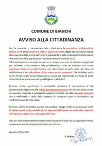Il comune di Bianchi ha lanciato un appello alla cittadinanza relativamente alle risorse idriche che, nel periodo estivo, tendono a venir meno. Soprattutto, sulla scorta di quanto capitato lo scorso anno, quando, causa utilizzo improprio, il paese del cosentino rimase a corto di riserve.