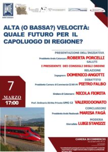 Giovedì 7 Marzo 2024, presso la Camera di. Commercio, sede di Catanzaro, in via Menniti Ippolito, alle ore 17, si i terrà un incontro sul tema “Alta (o bassa?) velocità: quale futuro per il capoluogo di regione?”