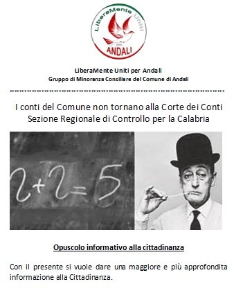 «Carissimi concittadini, ciò che di seguito vi stiamo comunicando, corrisponde alla reale e disastrosa situazione finanziaria del nostro Comune e non è propaganda politica. La Corte dei Conti , organo deputato, per legge, al controllo degli atti amministrativi, con deliberazione n. 92/2018 chiedeva chiarimenti istruttori e ulteriori elementi e atti a integrazione della documentazione acquisita in ordine di accertamento straordinario dei residui al 01/01/2015 e al rendiconto della gestione 2015, invitando il Sindaco e l’Organo di revisione dell’Ente, ciascuno per le sue competenze a fornire quanto sopra detto. Il comune di Andali, con nota 1197 del 05/07/2018, (prot. Sezione 4214 del 12/07/2018) a firma del Sindaco e del Responsabile del Servizio Finanziario, congiuntamente hanno risposto alle richieste di cui sopra. Le informazioni di che trattasi, trasmesse dal Comune di Andali, in risposta, non sono state sufficienti ai fini di una positiva valutazione dell’organo di Giustizia e Controllo contabile, il quale , ha evidenziato con deliberazione 79 del 03 giugno 2019, prima, e con deliberazione 144 del 23 giugno 2020, dopo, numerosi profili di debolezza, come le seguenti e gravi criticità: dati inattendibili e non veritieri, fondi non specificati, mancata ricostruzione dei fondi vincolati, irregolarità nella determinazione fondo cassa».