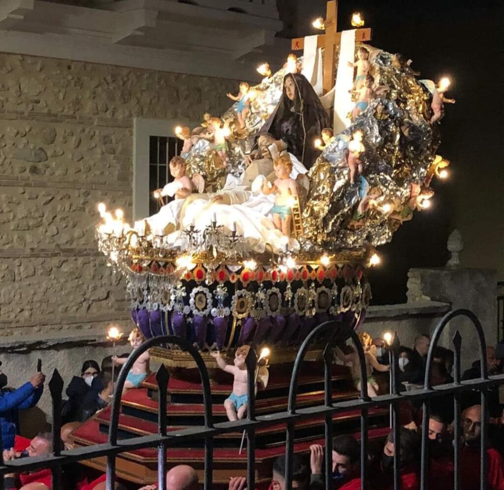 Aprirà il corteo lo stendardo della Congrega cinquecentesca vestito a Lutto, seguirà la croce penitenziale e il cristo con la corona di spine di asparago in testa,una tunica rossa e Scalzo nei piedi. Il divino maestro sarà braccato dai soldati romani che lo tormenteranno per tutto il tragitto. Per tradizione a portare la pesante croce di legno è un membro della Famiglia Femia per un voto fatto da un antenato più di un secolo fa. Seguirà la “Naca” un trono meraviglioso adornato di cristalli, sete pregiate e velluti alla cui sommità vi è la Madonna Addolorata che regge tra le braccia il proprio figlio morto.