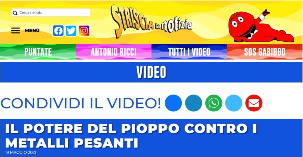 “Il potere del pioppo contro i metalli pesanti”, porta come titolo il servizio mandato in onda nel tg satirico di Canale 5, lo scorso 19 maggio 2021. Nel presentare il video trasmesso da Striscia la Notizia – contenuto nella rubrica Ambiente Giovani – viene accompagnato dalla seguente didascalia: «Il consulente scientifico Leonardo Tiralongo ci racconta come nella Terra dei fuochi siano stati utilizzati i pioppi per fronteggiare la contaminazione del terreno. Questo tipo di alberi, infatti, hanno il potere di bonificare e risanare l’intero ambiente, come spiega il prof. Massimo Fagnano dell’Università Federico II di Napoli».