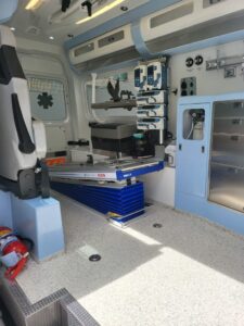 All’interno del vano sanitario c’è installato uno ionizzatore per la sanificazione continua, così come è dotata di un impianto elettrico con numerose prese, capace di alimentare contemporaneamente due termoculle e tutti gli elettromedicali e gli accessori. L’ambulanza è munita inoltre di un impianto di illuminazione potenziato con faretti orientabili verso le due postazioni di lavoro; al suo interno sono inoltre presenti due bombole di ossigeno da 10 litri ed una di aria compressa per la distribuzione sull’impianto interno.
