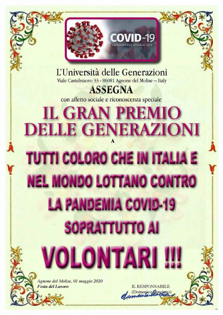 << La decisione di assegnare il Gran Premio delle Generazioni idealmente a tutti i combattenti contro il Covid-19 – afferma Domenico Lanciano, responsabile dell’annuale manifestazione – è stata obbligata non soltanto eticamente ma anche come affettuosa riconoscenza e civile gratitudine per chi, in particolare, rischia la vita nella cura dei contagiati in ogni parte del mondo. Ed è pure un modo per rendere omaggio ai tantissimi morti, una preziosa occasione per esprimere solidarietà ai familiari che hanno subìto le gravi perdite. Ed è un premio-incoraggiamento specialmente per chi quotidianamente da mesi è impegnato a sostenere, a vario titolo, l’intera macchina dei soccorsi. In particolare è dedicato ai Volontari. La pergamena del Gran Premio verrà inviata alla Protezione Civile come testimonianza italiana ma anche universale >>.