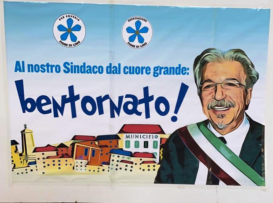 Sul cartello, la scritta a caratteri cubitali «Al nostro sindaco dal cuore grande: bentornato!» ad accompagnare la sua immagine come sempre sorridente e rassicurante, e con sullo sfondo gli elementi più tipici e riconoscibili del territorio comunale.