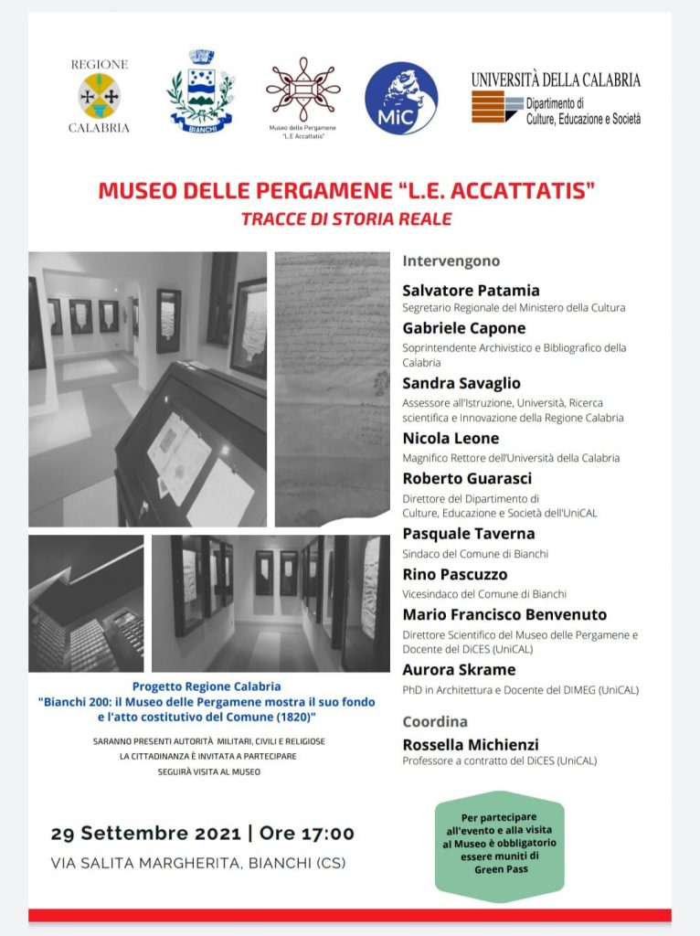 Successivamente, con atto n. 15 del 26 febbraio 2004, fu realizzato il “Museo delle pergamene” intitolato a “Luigi Accattatis”, uomo di cultura poliedrica, poeta e scrittore, mentre con atto deliberativo del Consiglio Comunale del 5 settembre 2019 N° 30, il Museo delle pergamene si è dotato di Statuto e Regolamento, grazie all’interessamento del sindaco di Bianchi, Pasquale Taverna, e dell’assessore alla Cultura, Rino Pascuzzo e di tutto i componenti il Consiglio Comunale. Con nota del Ministero della Cultura – Soprintendenza Archivistica e bibliografica della Calabria del 2309/2021, infine, viene autorizzata l’esposizione delle pergamene afferenti al fondo DNIS “Accattatis” presso la nuova sede del Museo delle pergamene “Luigi Elvio Accattatis”, sita in Via Salita Margherita del Comune di Bianchi (edificio ex Scuola Elementare).