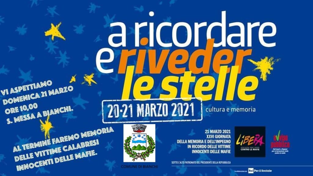 La ventiseiesima edizione promossa da Libera “La Giornata della memoria e dell’impegno in ricordo delle vittime innocenti delle mafie” ufficialmente riconosciuta dallo Stato con la legge n. 20/2017 col motto “A ricordare e riveder le stelle” che racchiude molti significati, soprattutto fare memoria, per la prima volto è approdata a Bianchi trovando leali sostenitori la parrocchia e l’Amministrazione comunale.