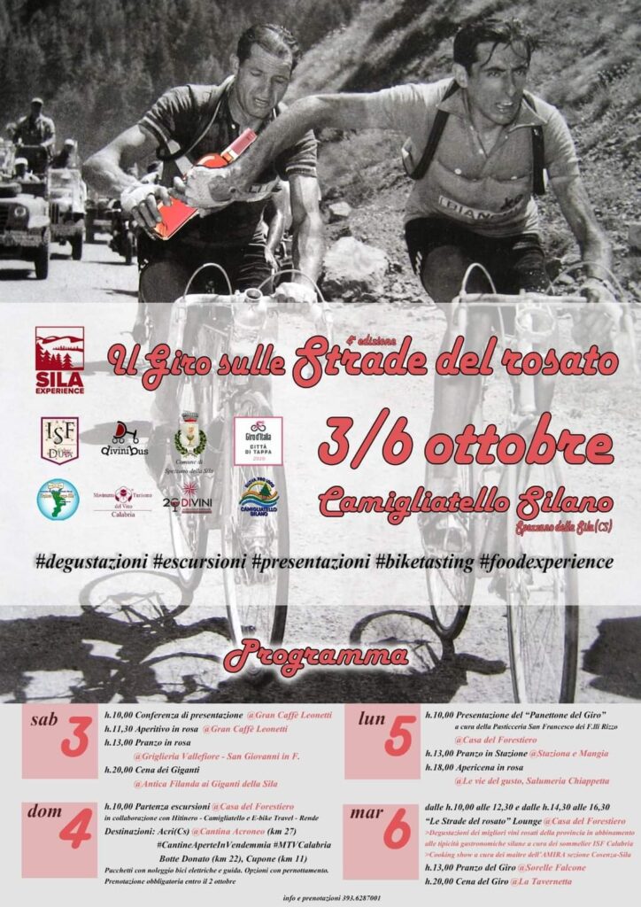 Infine il martedì, vigilia della tappa del Giro, aprirà le porte il villaggio rosè presso la Casa del Forestiero con oltre 10 banchi di assaggio di vini selezionati dai sommelier ISF e vincitori dei primi messi in palio allo scorso concorso sui vini rosati del tirreno svoltosi a Donnici nello scorso mese di giugno, tra cui il vino “Maglia Rosa”. Non solo vino ma anche gastronomia insieme ad alcune aziende produttrici del circuito Sila Experience, come l’azienda Scrivano, il consorzio della Patata della Sila, Bosco liquori con il loro Amaro Silano. Il tutto accompagnato da un’altra specialità la cui ricetta sarà proposta per l’occasione, ovvero il “Turdillo silano al flambè” a cura dei maitre dell’associazione Amira sezione Cosenza-Sila guidata da Biagio Talarico e sotto il coordinamento di Michele Giorno. Non mancherà anche per l’ultimo giorno il “Pranzo del Giro” presso le Sorelle Falcone in compagnia dei vini iGreco e la “Cena del Giro” che concluderà la rassegna presso la Tavernetta.