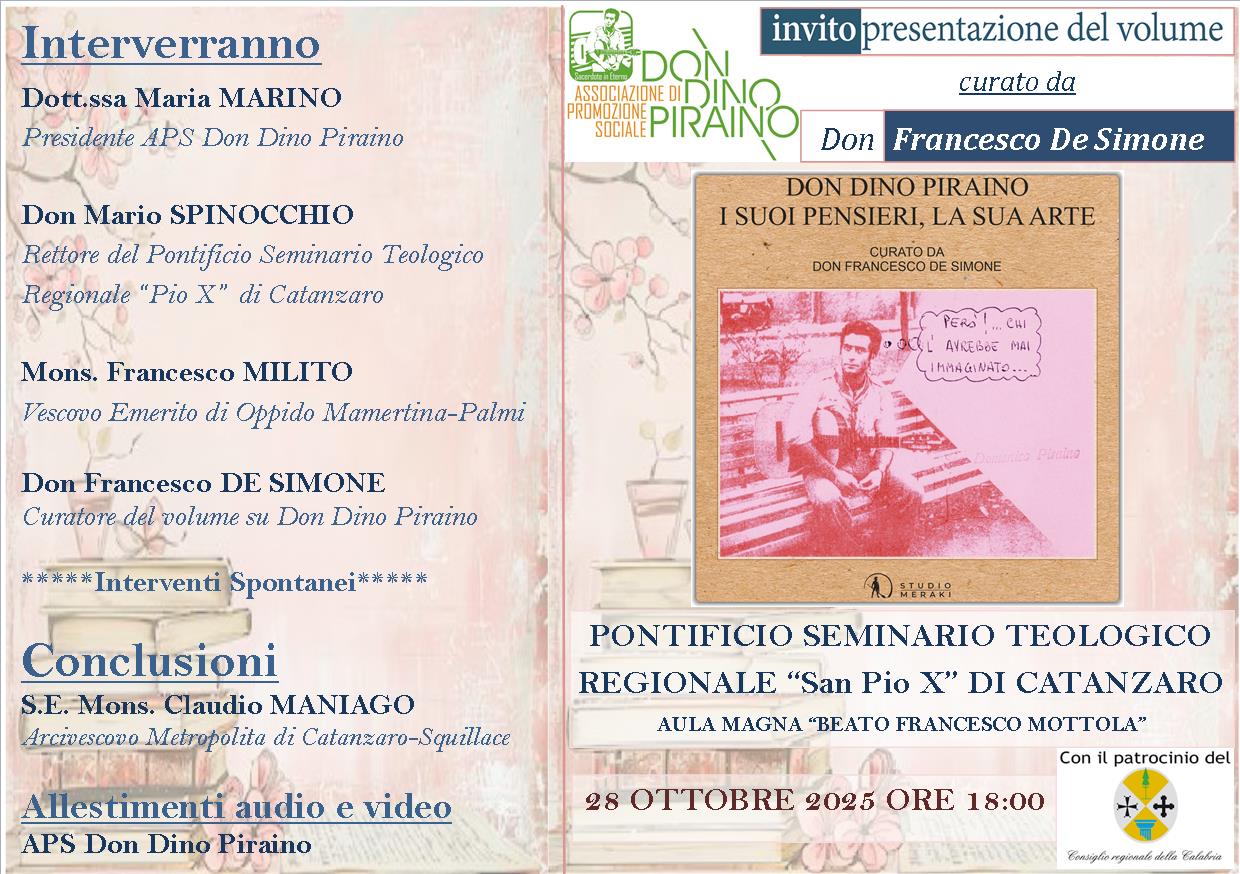 Sarà presentato martedì 28 ottobre alle ore 18,00, nell’Aula Magna del Seminario Teologico Regionale San Pio X, il volume “Don Dino Piraino i suoi pensieri, la sua arte”, curato da Don Francesco De Simone, che fu compagno di classe del sacerdote durante gli anni di studio in Seminario. E’ quanto riporta una nota firamta dalla presidente Maria Marino l’APS Don Dino Piraino di Catanzaro.