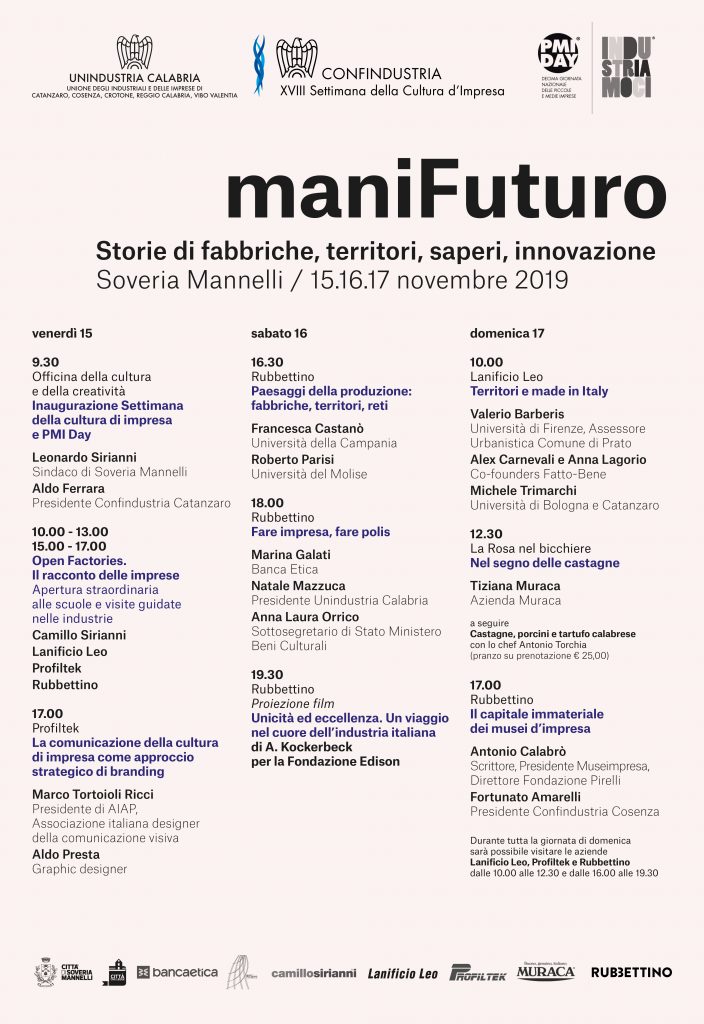 L’iniziativa, inaugurata con la X edizione del PMI Day è stata intitolata “maniFuturo. Storie di fabbriche, territori, saperi, innovazione” a significare che i luoghi della produzione hanno stretti legami con i territori che li ospitano fino talvolta a definirne l’identità.