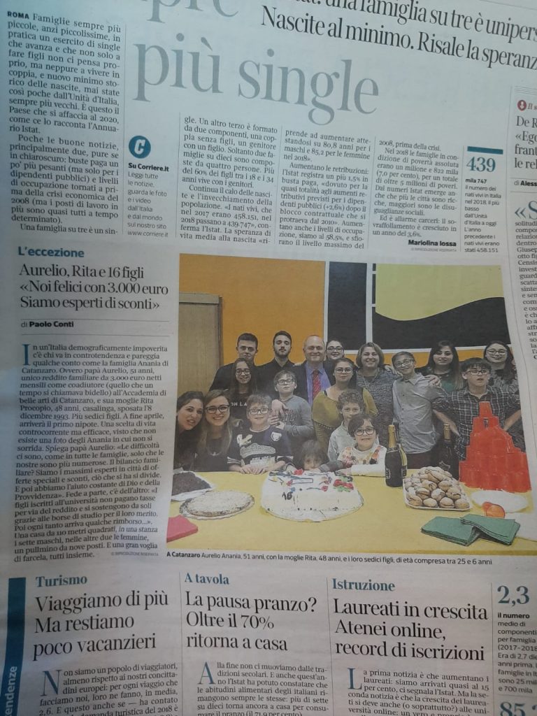 L’edizione di oggi del Corriere della Sera, pagina. 9, chiude l’anno 2019 indicando nella famiglia Anania, già ospite di Sanremo anni fa, un esempio controcorrente, un’eccezione in un Paese in cui, i dati fanno emergere la situazione della contrazione della popolazione, una famiglia su tre è unipersonale.