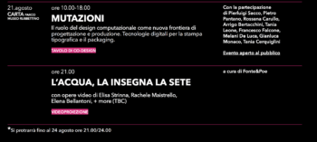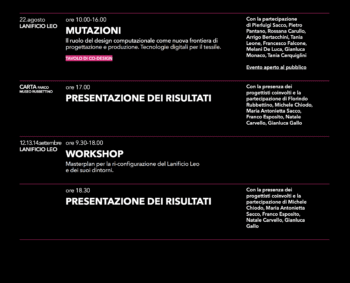 21 agosto – 10.00-18.00: Mutazioni, tavolo di co-design aperto al pubblico sul ruolo del design computazionale nella stampa tipografica e nel packaging, con la partecipazione di esperti e designer internazionali tra i quali ricordiamo Pierluigi Sacco, economista, specializzato in economia della cultura, sviluppo territoriale, industria creativa e politiche culturali e il matematico Unical Pietro Pantano, insieme a Rossana Carullo, Arrigo Bertacchini, Tania Leone, Francesco Falcone, Melani De Luca, Gianluca Monaco e Tania Cerquiglini.