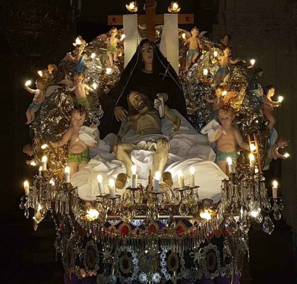 Il Cristo è aiutato dal cireneo braccato dai soldati romani e ogni venti/trenta passi si fa una genuflessione profonda. La stessa scena si ripeterà nelle chiese davanti gli Altari. La processione ospiterà anche una croce di quasi tre metri di lunghezza realizzata con i resti dell’imbarcazione andata in frantumi nella notte del 26 febbraio per naufragio di Cutro.