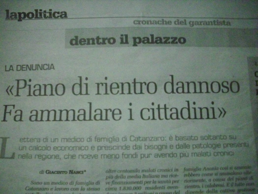 Sabato scorso (25 luglio 2015) sul “Garantista”, il quotidiano di Piero Sansonetti, è stata appunto pubblicata la lettera-denuncia del dottor Giacinto Nanci, con il titolo “Piano di rientro dannoso. Fa ammalare i cittadini”.