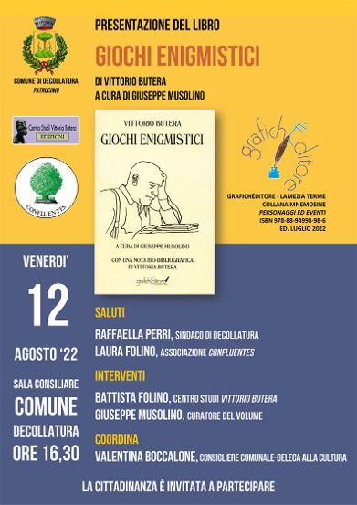 L’iniziativa è patrocinata dal Comune di Decollatura, dal Centro Studi Vittorio Butera e dall’Associazione Confluentes. Durante la presentazione si avrà modo di ascoltare qualche particolare in più sull’attività enigmistica di Vittorio Butera che auspicabilmente potrebbe spingere i lettori del volume a cimentarsi essi stessi con le soluzioni, visto che il curatore Giuseppe Musolino propone le soluzioni e le spiegazioni separatamente dai testi dei giochi.