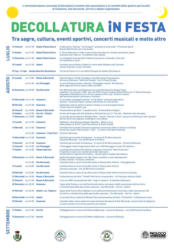 Dal palazzo municipale viene rilevato che è stato notevole l’impegno e la tenacia dell’assessore all’Istruzione e Cultura, Teresa Mazza, che si prodigata per riuscire a coordinare, invitandoli in più incontri, tutte le associazioni del territorio e i comitati delle quattro parrocchie di Casenove, Cerrisi, San Bernardo, Adami. Tutti insieme hanno realizzato il cartellone che contiene sagre, concerti, eventi sportivi ed altro, e porta come titolo “Decollatura in Festa”.