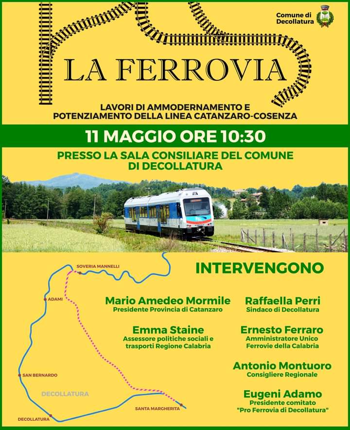 Decollatura – Dopo la storica conclusione positiva della Conferenza di servizi che conferma la permanenza del servizio ferroviario a Decollatura, sabato 11 maggio 2024 alle ore 10,30, presso la sala consiliare, è programmato un incontro sull’importanza della linea ferroviaria Catanzaro – Cosenza – gestita dalla società delle Ferrovie delle Calabria – per il comune e per tutte le aree interne.