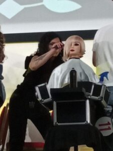 Entrando nel dettaglio del concorso, diciamo che i concorrenti si sono misurati con taglio e piega che sono alla base del know how del mestiere, realizzati, però, su una “testina”, ovvero un manichino a mezzo busto che, ed è questo l’aspetto di maggior criticità, doveva essere anche vestito e truccato. E, infatti la bravissima Sara ha saputo anche cucire su misura un abito per la sua “modella” e truccare il suo volto in modo brillante. Tutto questo in appena 40 minuti.