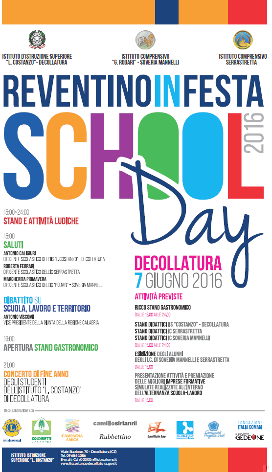 Reventino in Festa “School Day 2016”. Torna anche quest’anno l’evento più atteso dal mondo della scuola. E’ la manifestazione di fine anno scolastico organizzata per giorno 7 giugno dall’IIS “Costanzo” di Decollatura, con la collaborazione dell’IC di Soveria Mannelli e l’IC di Serrastretta, Comune di Decollatura, Lions di Soveria Mannelli, Coldiretti provinciale di Catanzaro, Campagna Amica, aziende del territorio: Arredi scolastici Camillo Sirianni, Rubbettino Editore, Lattificio Lee, Alassia Plant, Progetto Gedeone e altri operatori sociali ed economici del territorio del Reventino.