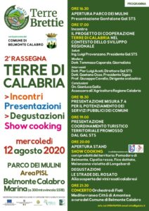 Si svolgerà nella giornata del 12 agosto 2020, presso il parco dei Mulini a Belmonte Calabro Marina, la seconda rassegna “Terre di Calabria” organizzata dal Gal STS Savuto Tirreno Serre Cosentine. Sono previsti una serie di incontri, presentazioni, degustazioni, show cooking e in serata concerto dell’Orchestra di fiati Mediterranea Città di Amantea.