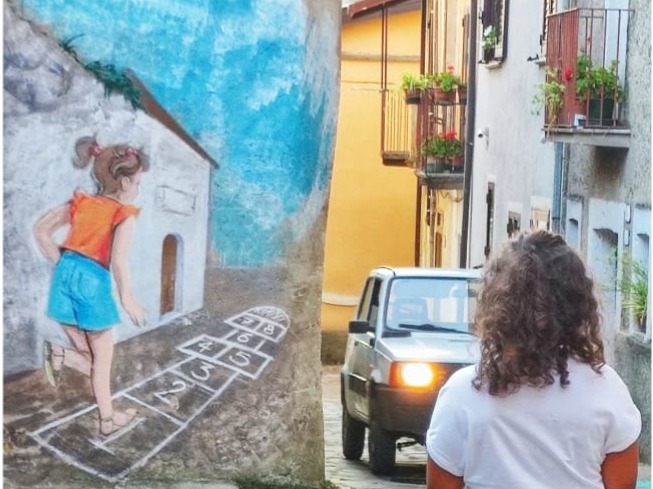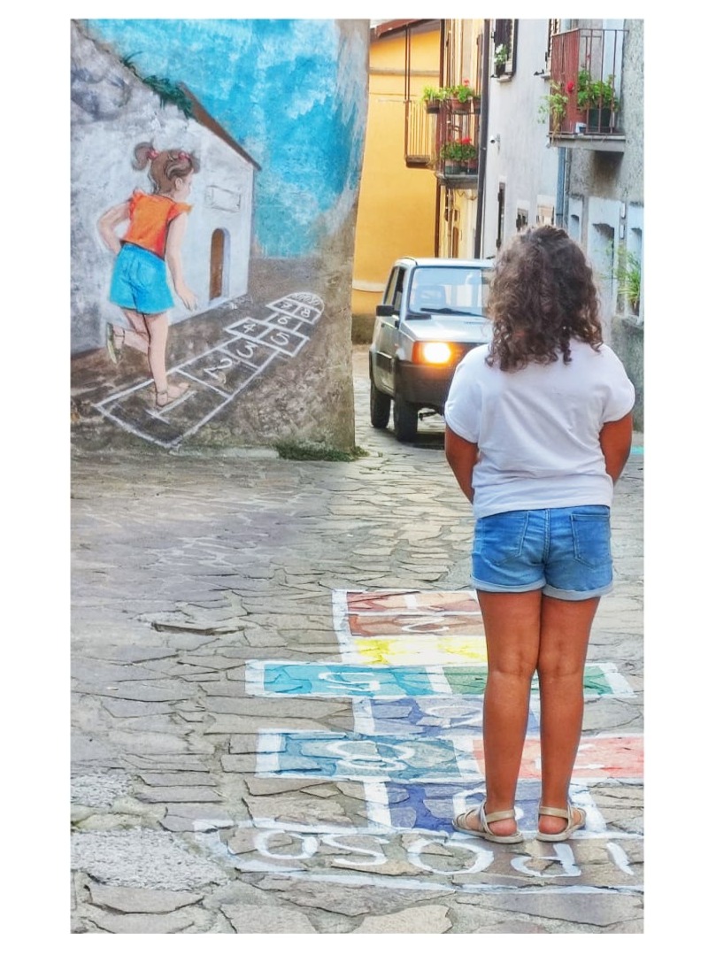 La bambina che gioca a “campana” – qui da noi, “riposo” – la ritroviamo di spalle nella fotografia e subito dopo nel bel murale che ha di fronte, opera di Francesca Crispino, in un doppio gioco di rimandi casuale e fuori dall’ordinario.