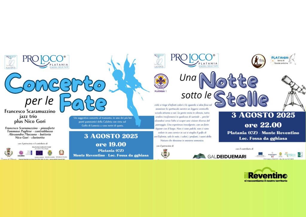 “Concerto per le Fate” e “Una Notte sotto le Stelle” sono questi i nomi degli eventi che si terranno a Platania (CZ) sul Monte Reventino sul belvedere in Loc. Fossa da gghiasa domenica 3 agosto 2025. Alle ore 19.00 il “Concerto per le Fate” organizzato dalla Pro Loco Platania APS, grazie al contributo del Comune di Platania nell’ambito del progetto PLATANIA: FATE E FUNGHI finanziato con risorse PAC 2014/2020 – Az. 6.8.3 – Avviso Attività Culturali 2023. Alle ore 22.00 “Una Notte sotto le Stelle” organizzata sempre dalla Pro Loco e dal Gruppo AGESCI-Platania I, nell’ambito del FESTIVAL DELLE ERRANZE E DELLA FILOXENIA, grazie al contributo del GAL dei Due Mari e al supporto del Comune di Platania.