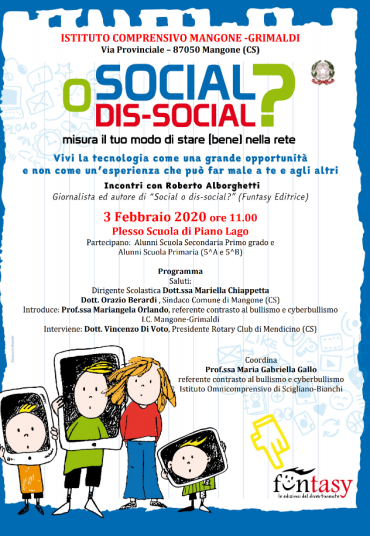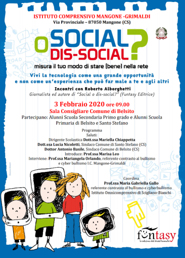 Una mattinata per rifletter sui temi suggeriti dal libro “Social o dis-social?” (Funtasy Editrice), in particolar modo sulle questioni legate alla prevenzione del cyberbullismo. E’ in programma LUNEDI 3 FEBBRAIO 2020 in due Comuni in provincia di Cosenza, Belsito e Piano Lago, facenti capo all’Istituto comprensivo Mangone-Grimaldi. guidato dalla Dirigente dott.ssa Mariella Chiappetta. L’iniziativa coinvolgerà gli allievi della Primaria e della Secondaria di 1°. L’iniziativa vede la collaborazione dei Comuni di Belsito, Mangone e Santo Stefano (CS). Il libro “Social o dis-social? / Misura il tuo modo di stare (bene) nella Rete”, è una pratica e coinvolgente guida per gli “under 14” invitati a vivere la tecnologia come una grande opportunità e non come un’esperienza che fa male a se stessi e agli altri. Ma ecco nel dettaglio il programma degli incontri.