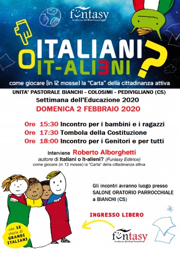 Il programma prevede i seguenti momenti con la presenza dell’autore, Roberto Alborghetti: Ore 15:30 Incontro con i bambini e i ragazzi delle Parrocchie dell’Unità pastorale; ore 17:30 Tombola della Costituzione; ore 18 Incontro con i genitori e con tutta la cittadinanza; interverranno don Giuseppe Trotta, le Suore Adoratrici del Santissimo Sacramento. Per Funtasy Editrice sarà presente con Paolo Sandini. Gli incontri avranno luogo presso il Teatro Comunale di Bianchi.