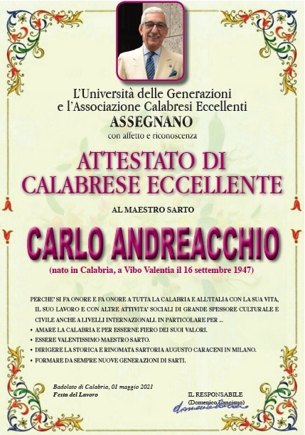 Ed un tributo d’amore alla sua Vibo Valentia vorrebbe dare il noto artista di moda sartoriale Carlo Andreacchio, direttore di una delle più famose ed antiche sartorie del centro di Milano, la “Augusto Caraceni” di Via Fatebenefratelli 16. Purtroppo un primo contatto effettuato tempo fa con le istituzioni locali per interessamento dell’Università delle Generazioni non ha sortito ancora alcun riscontro.