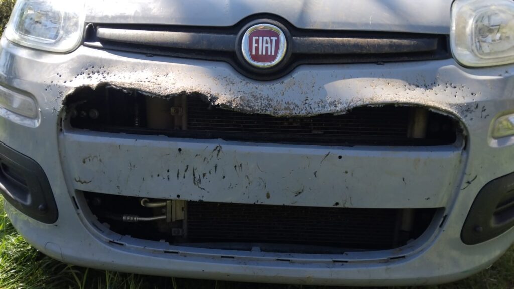 Un brutto risveglio è stato quello di sabato mattina per i proprietari della Fiat Panda, parcheggiata nel cortile di casa, ad Adami, come avviene tante volte: essi sono rimasti allibiti nel vedere la loro auto completamente distrutta nella parte anteriore, con la targa divelta e quello che rimane della carrozzeria pieno di morsi.