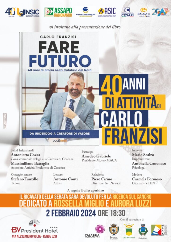 La serata sarà caratterizzata dalla presentazione del libro “Fare Futuro: Quarant’anni di Storia Nella Calabria del Nord”, scritto dallo stesso Franzisi in onore di questa significativo traguardo. Il libro racconta la storia di quattro decenni di impegno e tanto lavoro per la crescita economica e sociale della Calabria. La serata  è anche un tributo speciale a due figure straordinarie care all’autore: la talentuosa scrittrice Aurora Luzzi, tragicamente scomparsa nel 2021, e la Psicologa Rossella Miglio, che ha combattuto coraggiosamente prima di lasciarci nel 2023.