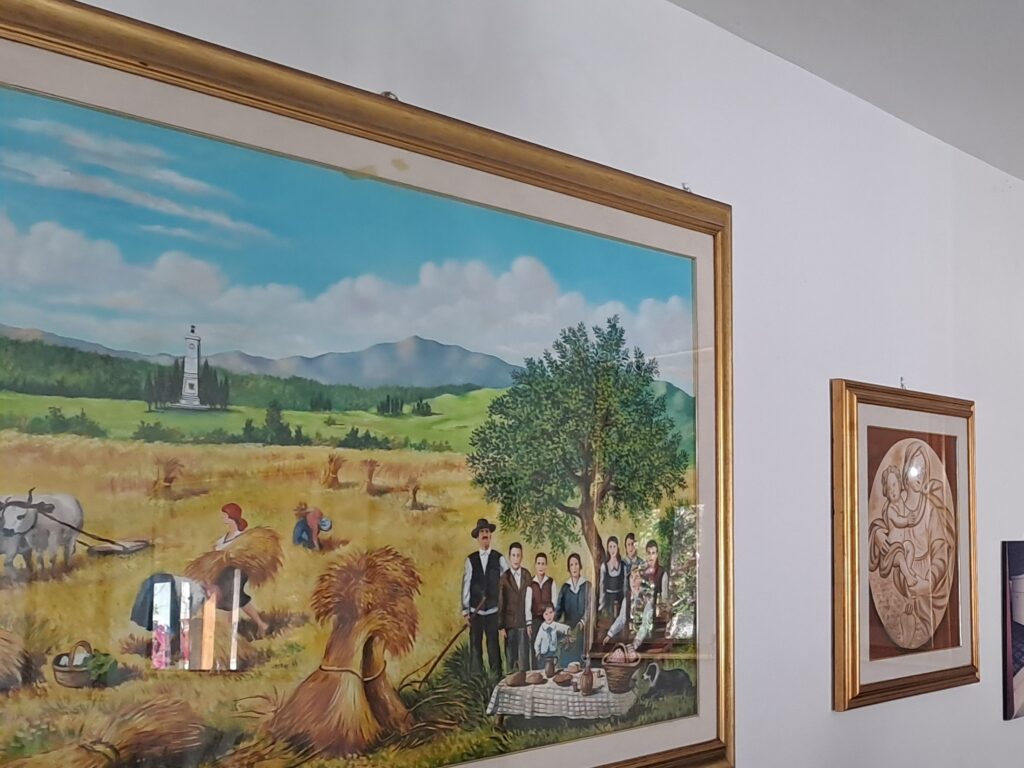 I temi sono quelli voluti dal committente e spaziano dal brigantaggio al rito della mietitura d’altri tempi, dai Vespri soveritani all’obelisco che rende onore all’impresa di Garibaldi e dei suoi “mille”, presente un po’ ovunque come elemento caratterizzante e in qualche modo rassicurante.