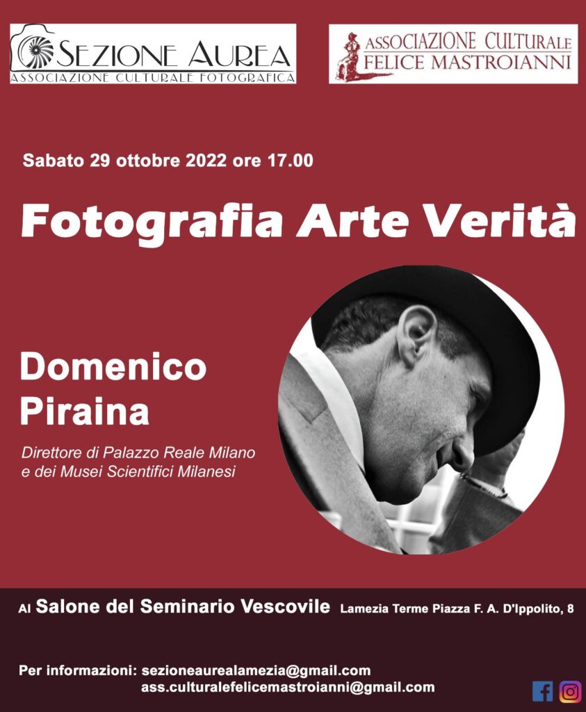 Relatore sarà Domenico Piraina, direttore di Palazzo Reale a Milano e dei Musei Scientifici Milanesi che ci parlerà di “FOTOGRAFIA ARTE VERITÀ”.