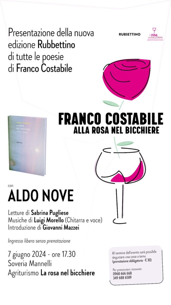 Per la prima volta un unico volume, intitolato “La rosa nel bicchiere. Tutte le poesie“ raccoglie tutta l’opera poetica di Franco Costabile, tra le voci più alte della poesia del Novecento e troppo a lungo dimenticato, ingiustamente, dalla critica. Il volume in uscita per Rubbettino sarà in libreria a partire dal 7 giugno. Originario di Sambiase, oggi quartiere di Lamezia Terme, Costabile, durante gli anni trascorsi a La Sapienza di Roma, fu allievo di Giuseppe Ungaretti con il quale instaurò uno stretto legame di amicizia.