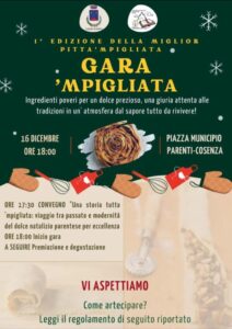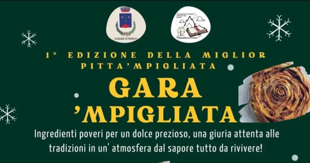 L’amministrazione comunale di Parenti, in collaborazione con l’ associazione “Cultura e Sila”, propone, nel pomeriggio del prossimo 16 dicembre 2022, a partire dalle ore 17.30, la prima edizione della gara di pitta ‘mpigliata dolce tipico calabrese molto diffuso in tutta l’area silana.