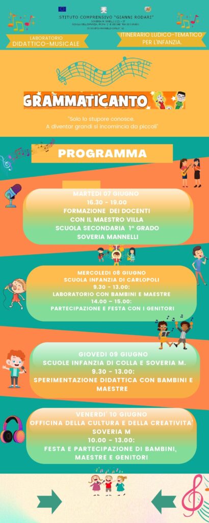 “Grammaticanto: Solo lo stupore conosce. A diventar grandi si incomincia da piccoli”. Itinerario ludico-tematico per l’lnfanzia. Su questi temi si è svolto un corso di formazione laboratoriale condotto dal maestro Alberto Villa presso l’Istituto Comprensivo “Gianni Rodari” di Soveria Mannelli – Carlopoli.