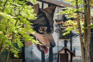 L’artista spagnolo WedoGoas invece, ospite di Camigliatello Silano, nel cuore della Sila, ha utilizzato la parete del Bar Tasso presso gli impianti sciistici di risalita rappresentando quello che è il re dell’altopiano silano, il Lupo. Giocando con il colore e con il bianco e nero, WedoGoas ha voluto sottolineare l’importanza e la fragilità di questo stupendo animale, non a caso il titolo dell’opera, “Balance”, sta a sottolineare quanto la presenza del lupo nelle foreste bilanci l’intero ecosistema silano. L’opera che si mimetizza alla perfezione nel paesaggio ha regalato un volto nuovo a quello che è il cuore pulsante dell’economia di Camigliatello e Spezzano della Sila, raccogliendo l’entusiasmo di tutta la cittadinanza e degli operatori dell’impianto. Un’operazione realizzata in un punto fortemente centrale, crocevia turistico dell’intero territorio calabrese.