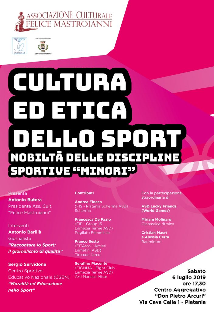 In una nota pervenuta in redazione, diffusa da Antonio Butera, presidente dell’associazione culturale “Felice Mastroianni”,  viene specificcato che l’incontro porta come titolo: “Cultura ed Etica dello Sport. Nobiltà delle Discipline Sportive “Minori”.