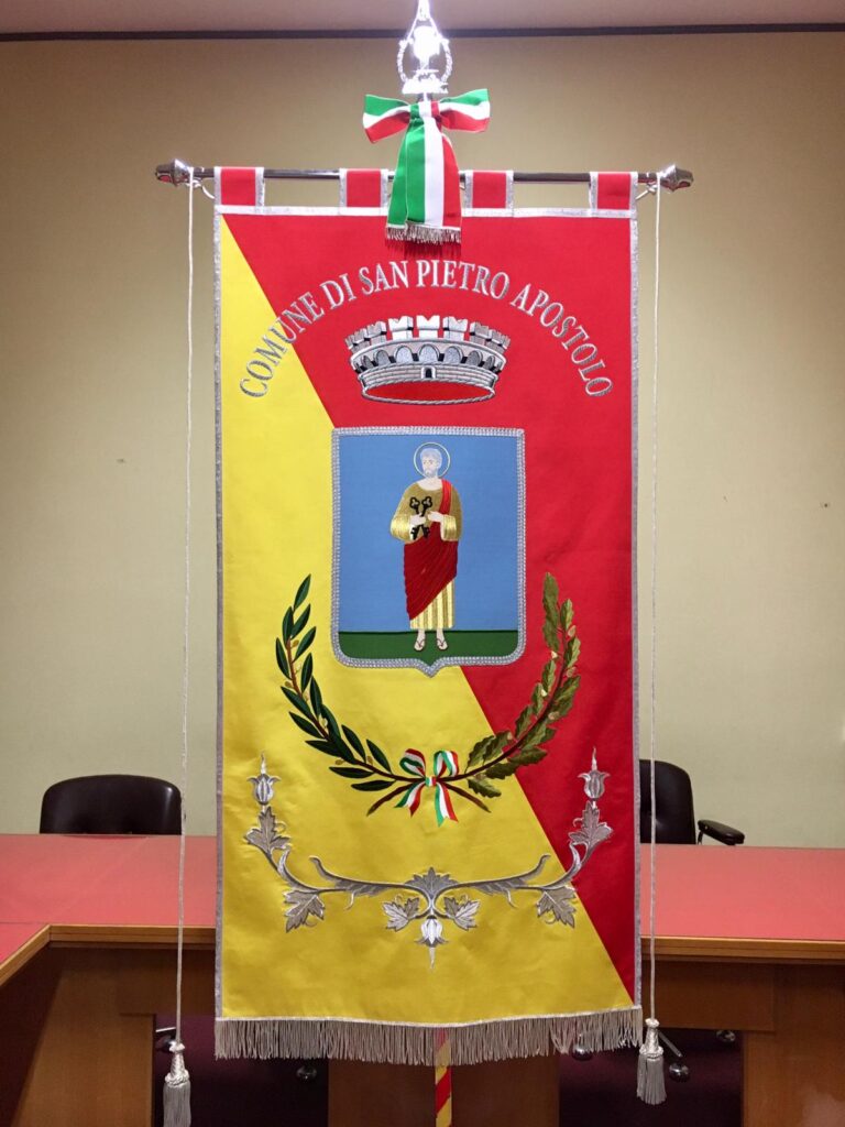 L’emozione di quel momento si ripropone oggi nelle parole del primo cittadino: «Con orgoglio e commozione consegniamo oggi a tutta la comunità il gonfalone raffigurante lo stemma ufficiale della sacra effige del nostra Santo patrono. Da parte mia un doveroso e sentito ringraziamento al dott. Giuseppe Fazio che per primo e più di tutti ha seguito la vicenda. Purtroppo il momento particolare legato all’emergenza sanitaria non ci consente di sancire questo momento con una cerimonia solenne ed ufficiale. L’auspico mio e di tutta l’Amministrazione è quello che, in concomitanza con la solenne festività in onore di San Pietro Apostolo del 29 giugno prossimo, sarà possibile condividere questo importante risultato con tutta la popolazione. L’intera comunità è fiera ed orgogliosa, San Pietro Apostolo è uno dei pochi comuni italiani a potersi fregiare dell’effige del proprio patrono sul proprio stemma. Recuperare e convalidare l’antico stemma comunale è stato un atto dovuto a questa comunità tanto devota al proprio Santo protettore, la Sua prestigiosa effige, restituisce il giusto blasone al gonfalone municipale oltre che consentire all’Ente l’utilizzo legale del proprio stemma».