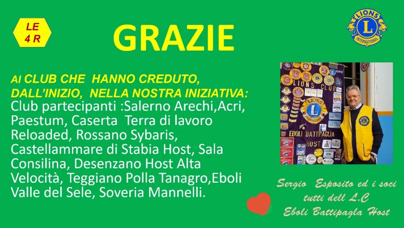 <<Grazie a tutti gli amici dei vari Lions Club – ha rilevato il presidente Sergio Esposito – che hanno creduto e preso parte al service nazionale sostenendo il progetto Le 4 R per salvare l’ambiente: recupero, riciclo, riduzione, riutilizzo>>.