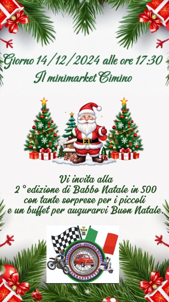 Non, però, una Santa Claus qualsiasi, bensì a bordo di una fiammante 500 d’epoca. Eh sì, perché, per il secondo anno consecutivo, a Soveria Mannelli, arriveranno le auto storiche radunate dall’Associazione “Piccole Ruote” di Serrastretta che riempiranno Piazza dei Mille davanti al market e i locali dello stesso, dove il barbuto e canuto anziano signore vestito di rosso avrà tante meravigliose sorprese per tutti i bambini che parteciperanno a questa nuova edizione di “Babbo Natale in 500”.