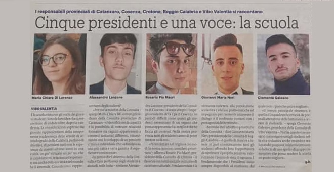 Nell’articolo compaiono due foto estratte da Noi Magazine – supplemento del quotidiano Gazzetta del Sud – riguardanti la prima pagina con le notizie sulla Consulte studentesche della Calabria e sui cinque presidenti provinciali di Catanzaro, Cosenza, Crotone, Reggio Calabria e Vibo Valentia.