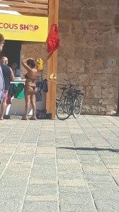 La foto non è mia ma di una signora del luogo che ha trovato un po’ indecente la presenza di quella donna mezza nuda proprio davanti alla piazza e all’ingresso della chiesa principale della cittadina. Certo siamo in una località balneare, ma probabilmente un minimo di decoro urbano non farebbe male. Un conto è stare sulla spiaggia così, un conto davanti ad una chiesa e in piazza. Ci sono suscettibilità locali da rispettare!