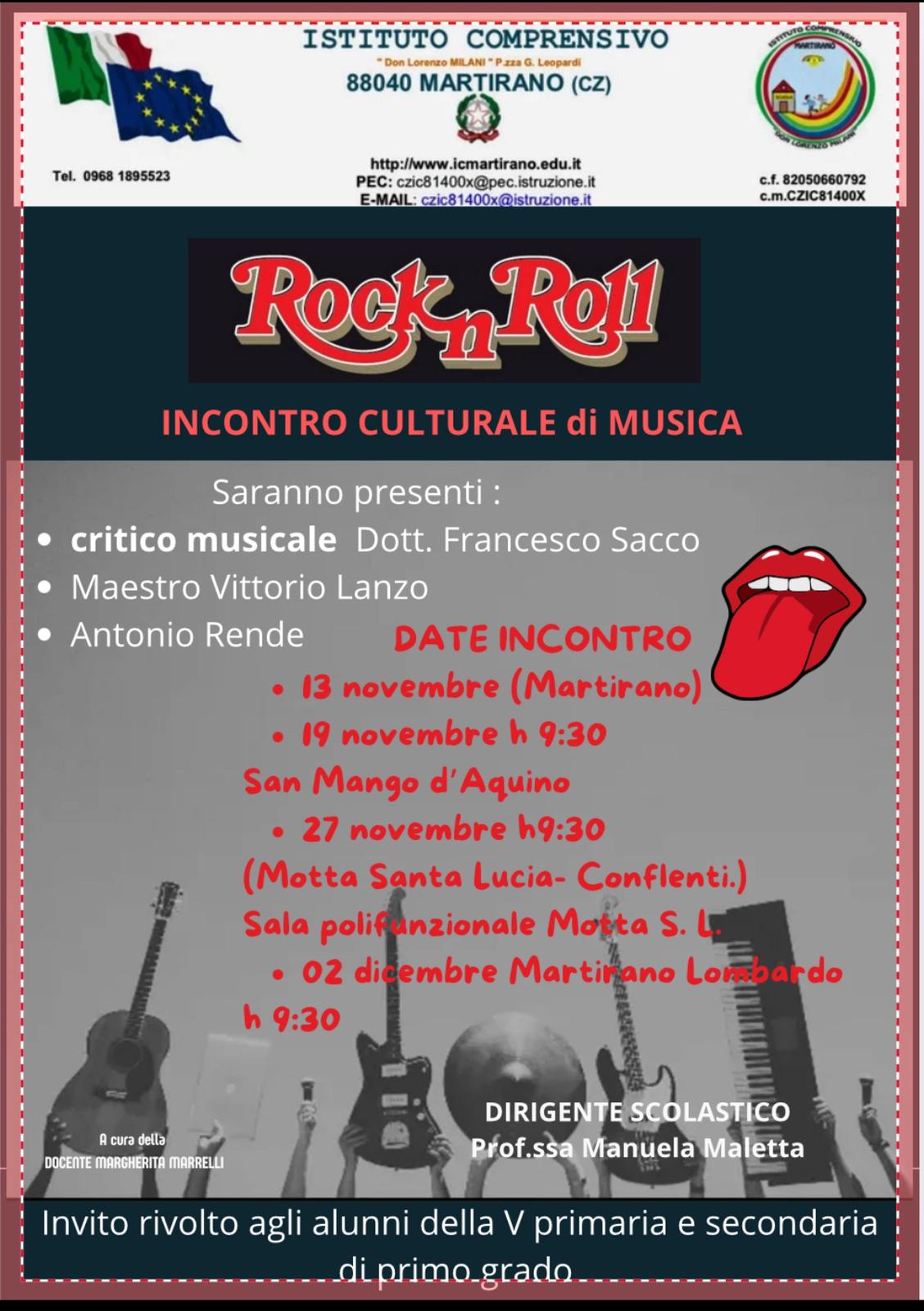 Ritornado agli incontri nelle scuole, riguardo l’iniziativa, che ha avuto luogo nei giorni 12, 19, 27 novembre e 2 dicembre 2025, coordinata da Margherita Marrelli, docente funzione strumentale, si è svolta sotto forma di lezione-concerto, durante la quale gli studenti, attenti e curiosi, dei plessi di Martirano, San Mango d’Aquino, Motta S. Lucia, Conflenti e Martirano Lombardo hanno assistito non solo al racconto sulle origini del rock’n’roll e delle sue principali evoluzioni, ma hanno anche potuto ascoltare brani eseguiti dal vivo dai musicisti, alternando così momenti di ascolto a spiegazioni didattiche.