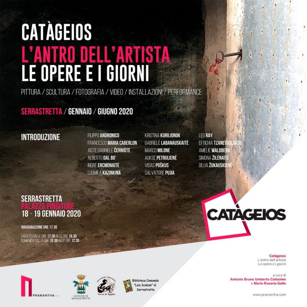 Il primo appuntamento – previsto per il prossimo sabato 18 gennaio 2020, con inaugurazione alle ore 17.30 presso Palazzo Pingitore di Serrastretta – prevede una mostra collettiva di pittura, scultura, fotografia e video e sarà il saggio del programma con la presentazione dei 17 artisti protagonisti del progetto Catàgeios: Filippo ANDRONICO, Francesco Maria CABERLON, Aistė Gabrielė ČERNIŪTĖ, Alberto DAL BO’, Indrė ERCMONAITĖ, Ludmila KAZINKINA, Kristina KURILIONOK, Gabrielė LABANAUSKAITĖ, Marco MILONE, Auksė PETRULIENĖ, Salvatore PUJIA, Vidas POSKUS, Leo RAY, Eftichia TZANETOULAKOU, Amélie WALDBERG, Simona ŽILĖNAITĖ, Gilija ŽUKAUSKIENĖ. La mostra sarà presentata dal direttore del progetto Antonio Bruno Umberto Colosimo e dall’artista lituana Kristina Kurilionok.