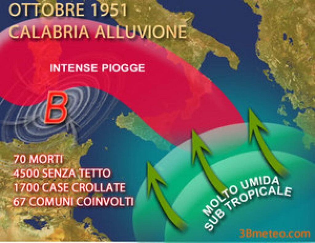 A metà ottobre 1951 una estesa perturbazione, a carattere ciclonico, proveniente dall’Africa sahariana ha investito, con il suo massimo epicentro in Calabria, tutta l’Italia fino in Sardegna e nel Veneto del Polesine.