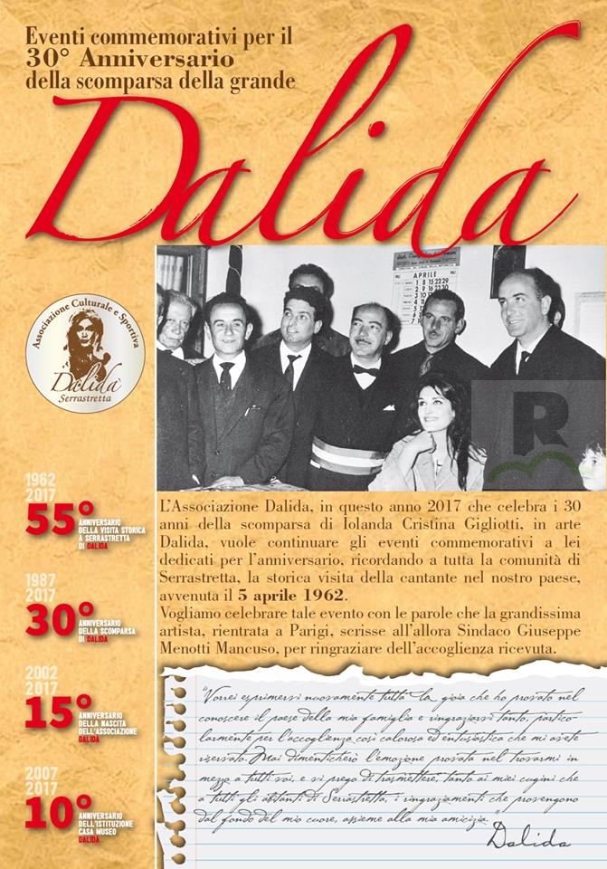 A tal proposito è da rilevare che a Serrastretta ha sede ed opera da tanti anni, svolgendo un’attività costante nel tempo, l’associazione culturale Dalidà. Il sodalizio porta avanti un impegno proteso a ricordare la concittadina e l’artista, all’anagrafe iscritta come Cristina Iolanda Gigliotti, la grande cantante e attrice universalmente più conosciuta come Dalida, le cui radici affondano in Calabria entrambi i genitori erano originari di Serrastretta anche se il legame diretto con il paese calabrese era stato interrotto dal nonno Giuseppe Gigliotti che emigrò proprio da Serrastretta alla volta del Cairo in Egitto.