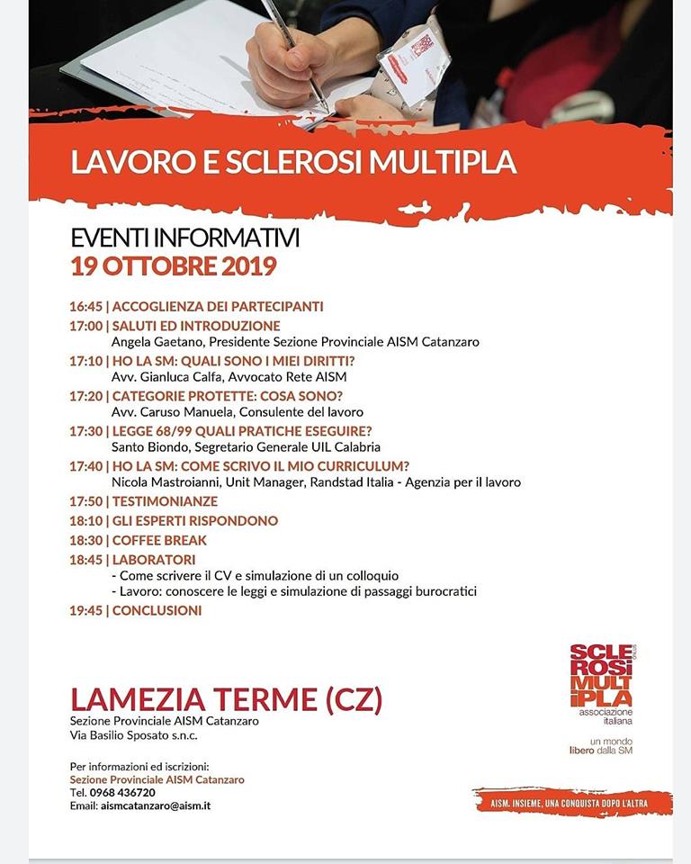 Intanto nell’ambito delle attività programmate è stato organizzato l’incontro informativo “Lavoro e sclerosi multipla” per affrontare insieme alle persone con sm il tema del lavoro, dalla ricerca alle pratiche annesse. Molto spesso le persone con sm hanno problemi a riguardo perché non sanno come muoversi al meglio. Discuteranno con i presenti, giorno 19 ottobre 2019 alle 16,45, presso la sezione provinciale AISM in via Basilio Sposato a Lamezia Terme, l’avvocato Gianluca Calfa della rete Aism che affronterà il tema “Ho la sm: quali sono i miei diritti?” entrerà nel dettaglio delle categorie protette l’avvocato Caruso Manuela, consulente del lavoro. Riguardo la legge 68/1999 che ha come finalità promuovere l’inserimento e l’integrazione lavorativa delle persone disabili nel mondo del lavoro, incentrerà l’intervento Santo Biondo, Segretario Generale UIL Calabria. Nicola Mastroianni Unit Manager Randstad Italia – Agenzia per il lavoro invece spiegherà come scrivere un curriculum efficace. Dopo le consuete domande agli esperti, si passerà ai laboratori pratici: il primo verterà intorno alla compilazione di un curriculum e alla simulazione di un colloquio, il secondo riguarderà le leggi e i passaggi burocratici. «Questo incontro informativo – ha spiegato Angela Gaetano presidente sezione AISM Catanzaro – non vuole restare fine a se stesso, lo abbiamo pensato in questa formula che prevede dopo la parte teorica anche una pratica di laboratorio, perché così strutturato potrà dare meglio risposte concrete ai bisogni delle persone con sm».