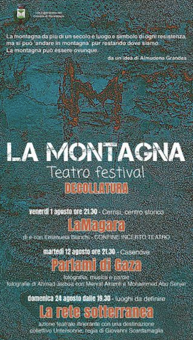 Premio della Critica al Roma Fringe Festival nel 2014. In questo momento e da molto tempo, troppo tempo, c’è un popolo che ha bisogno della forza di tutti per esistere e resistere: il popolo palestinese. Lo raccontano da vicino Mervat Alramli, Mohammed Abu Senjer e Ahmad Jarboa, palestinesi della diaspora e non, con Parlami di Gaza (martedì 12 agosto a Casenove). Il loro è un accorato appello che emerge dalle ceneri di un genocidio in corso. I tre artisti uniti per mostrare la storia di una terra distrutta, di un popolo decimato, di migliaia di vite perdute. Le letture di Mervat, nata a Gaza e in Italia dall’età di 12 anni, dicono dei ricordi di un’infanzia rubata. Le note dal vivo dell’oud di Mohammed, sopravvissuto alla violenza di Gaza e in Italia da pochi mesi, tra improvvisazioni e brani tradizionali, rivelano il dolore e la capacità di resilienza. Entrambi accompagnano la mostra fotografica di Ahmad, infermiere e fotografo, attualmente sfollato in una tenda a Gaza. Per La rete sotterranea – azione teatrale itinerante con una destinazione (domenica 24 agosto in luoghi diversi che si scopriranno in seguito), l’artista e regista Giovanni Scardamaglia sceglie di elaborare l’esistente, con materiali in prestito o recuperati, con le mani nella terra di Decollatura. L’azione prova a ridefinire la relazione dell’umano con lo spazio e con ciò che lo abita. L’intervento collettivo, che è preambolo allo spettacolo, prevede il coinvolgimento di persone del luogo o di passaggio, attori loro malgrado. Singolari soggetti si aggirano per il paese, i portatori, che, a coppie, portano con sé il simulacro di un albero in una processione/parata per approdare infine in un “teatro” in cui assistere allo spettacolo che scruta la possibilità di vivere nelle rovine del capitalismo.